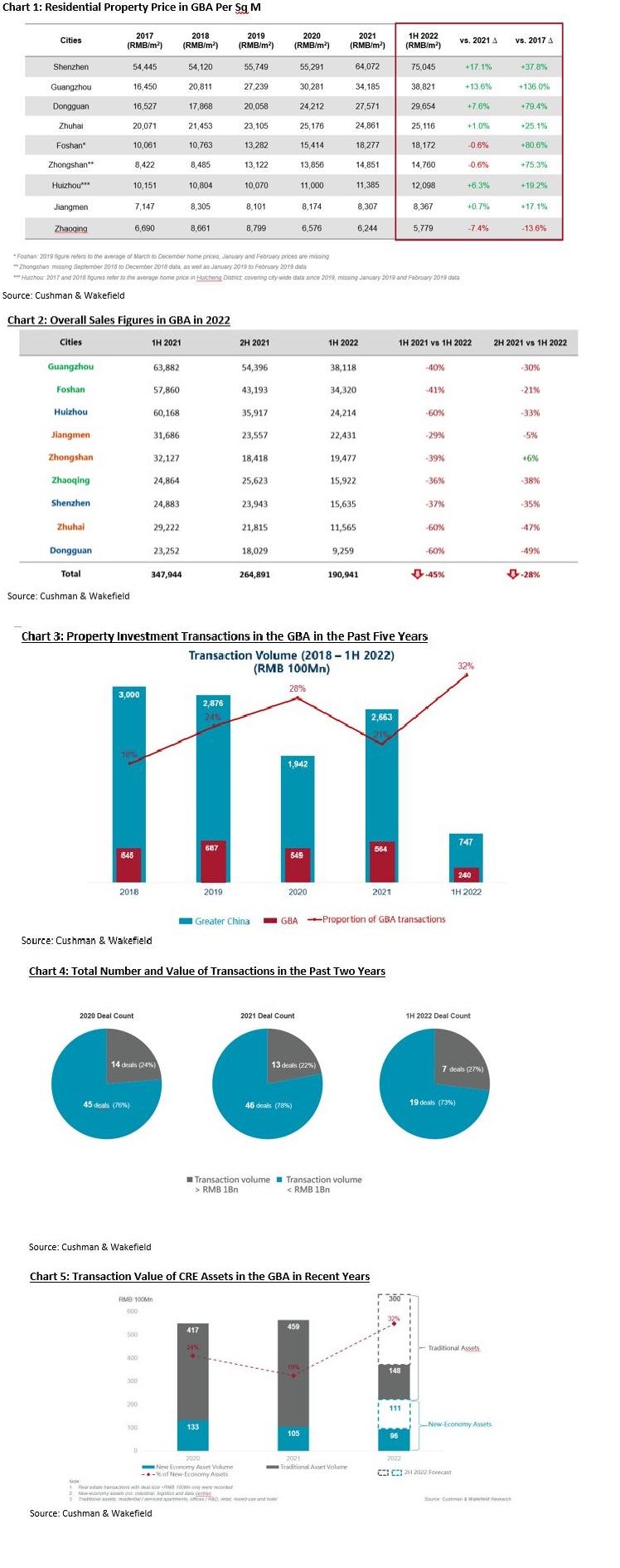 Alva To, Cushman & Wakefield’s Vice President, Greater China & Head of Consulting, Greater China mentions, “The increment of first-and-second-hand residential property prices in the GBA in 1H 2022 was driven by transactions of premium and luxury properties, while we expect the price to remain stable throughout the year. Despite a plunge in overall transaction volume in 1H 2022, we expect the transaction volume to increase by 5% to 10% as the government’s control measures ease.”