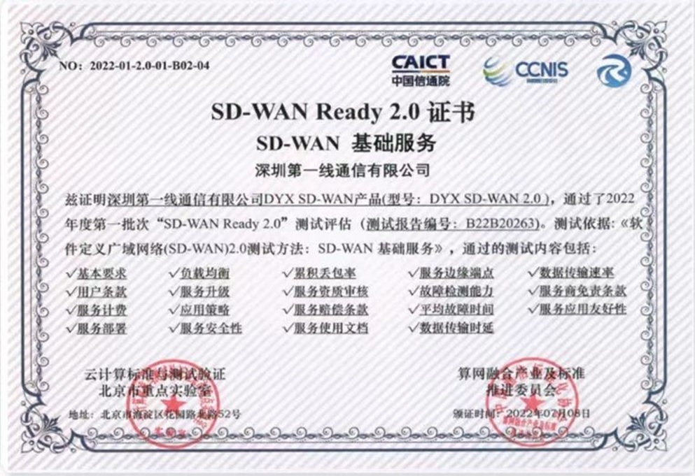 The evaluation covered multiple aspects of the solution including: service deployment, load balancing, service security, application strategy, fault detection capability, data transmission latency, data transmission speed, etc. DYXnet SD-WAN solution has successfully passed all 19 items in the “SD-WAN Ready 2.0” test requirement, which indicates the quality and technical capabilities are above SD-WAN’s industrial standards and technical norm.
