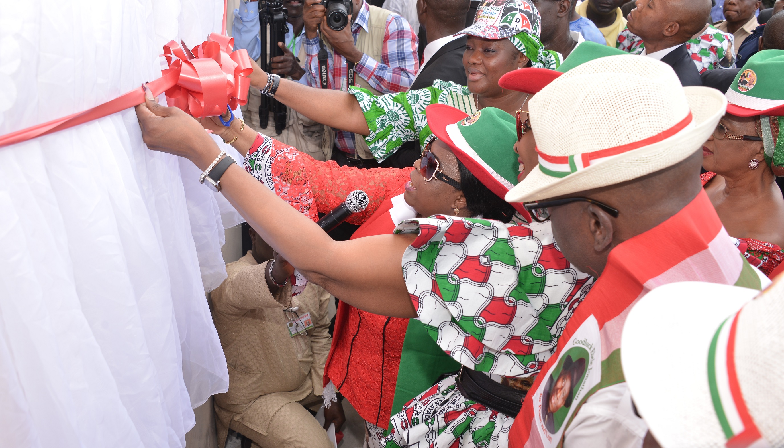 The First Lady,Dame Patience Jonathan flanked by wife of Cross River Gov., Mrs. Obioma Liyel Imoke and Gov. Liyel Imoke of Cross River,(Left) and wife of Akwa Ibom Gov., Mrs. Ekaette Akpabio cutting tape to commission the 6,000 capacity stadium in Ikom, Cross River ahead of the PDP National Women Rally in Ikom Wednesday, 25/2/15