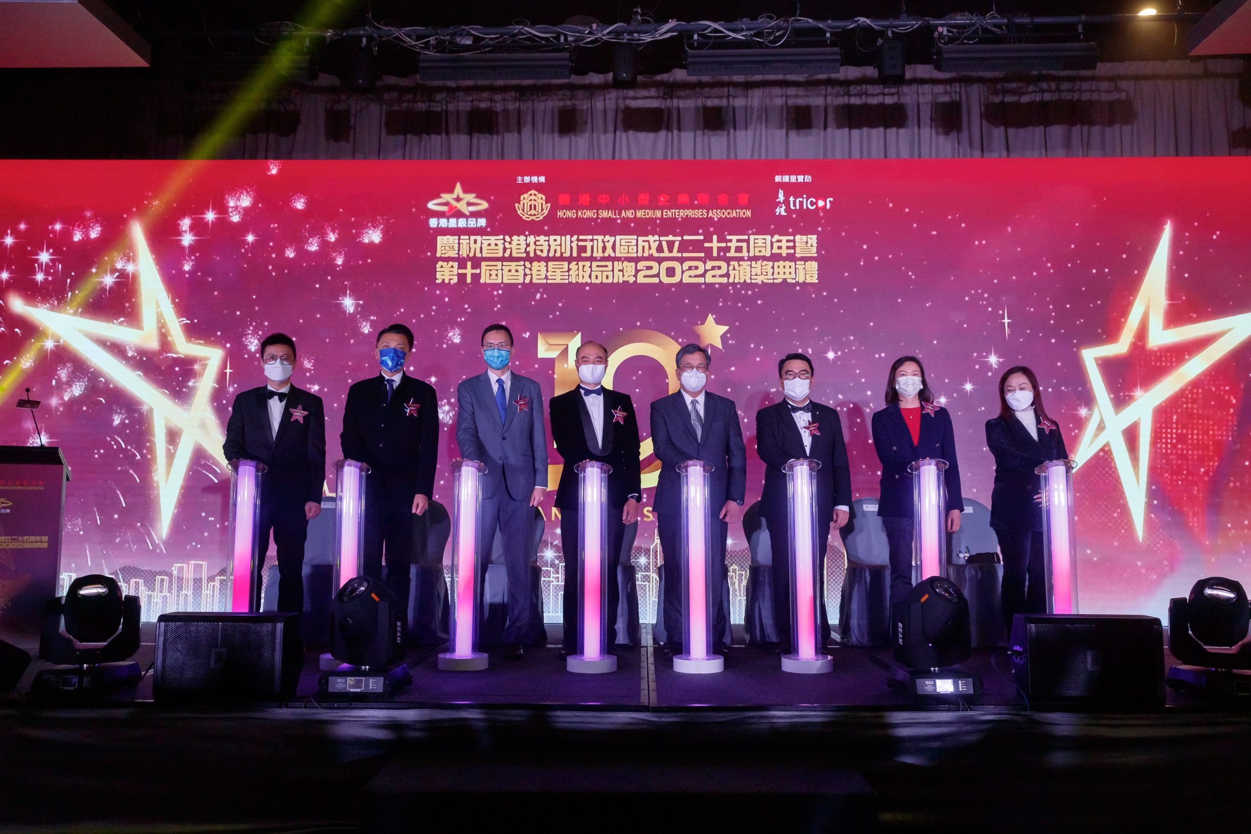 Mr Algernon Yau, JP. Secretary for Commerce and Economic Development, was the guest-of-honour for the “Hong Kong Star Brands 2022” Award Presentation Ceremony. Joining the officiating party were Ms Maggie Wong, JP, Director-General of Trade and Industry; Hon Mr Sunny Tan, Chairman of Hong Kong Productivity Council and Legislative Council Member; Ir Hon Mr Lee Chun-keung, Legislative Council Member; Hon Ms Chan Hoi-yan, Legislative Council Member; President Mr Andrew Kwok and Chairman Mr Calvin Cheng of Hong Kong Small and Medium Enterprises Association, as well as Mr Man Fok, Chairman of Hong Kong Star Brand 2022 Organizing Committee.