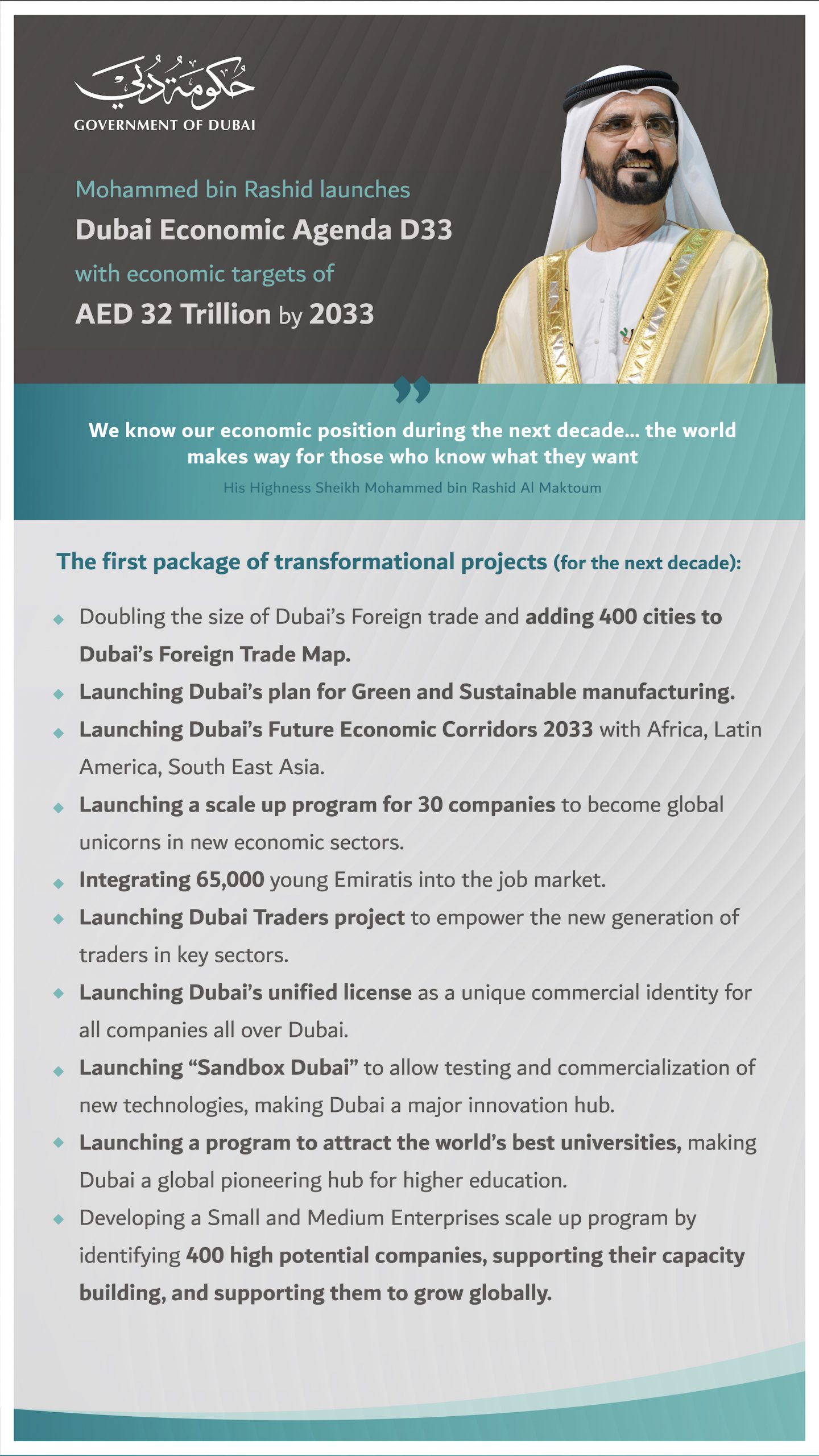 Agenda ‘D33’ also includes the launch of the Dubai Project to attract the world’s best universities, as part of the broader aim of making Dubai a leading global hub for higher education, and a programme to promote the growth of SMEs by identifying 400 high-potential companies and supporting their capacity-building and global expansion.