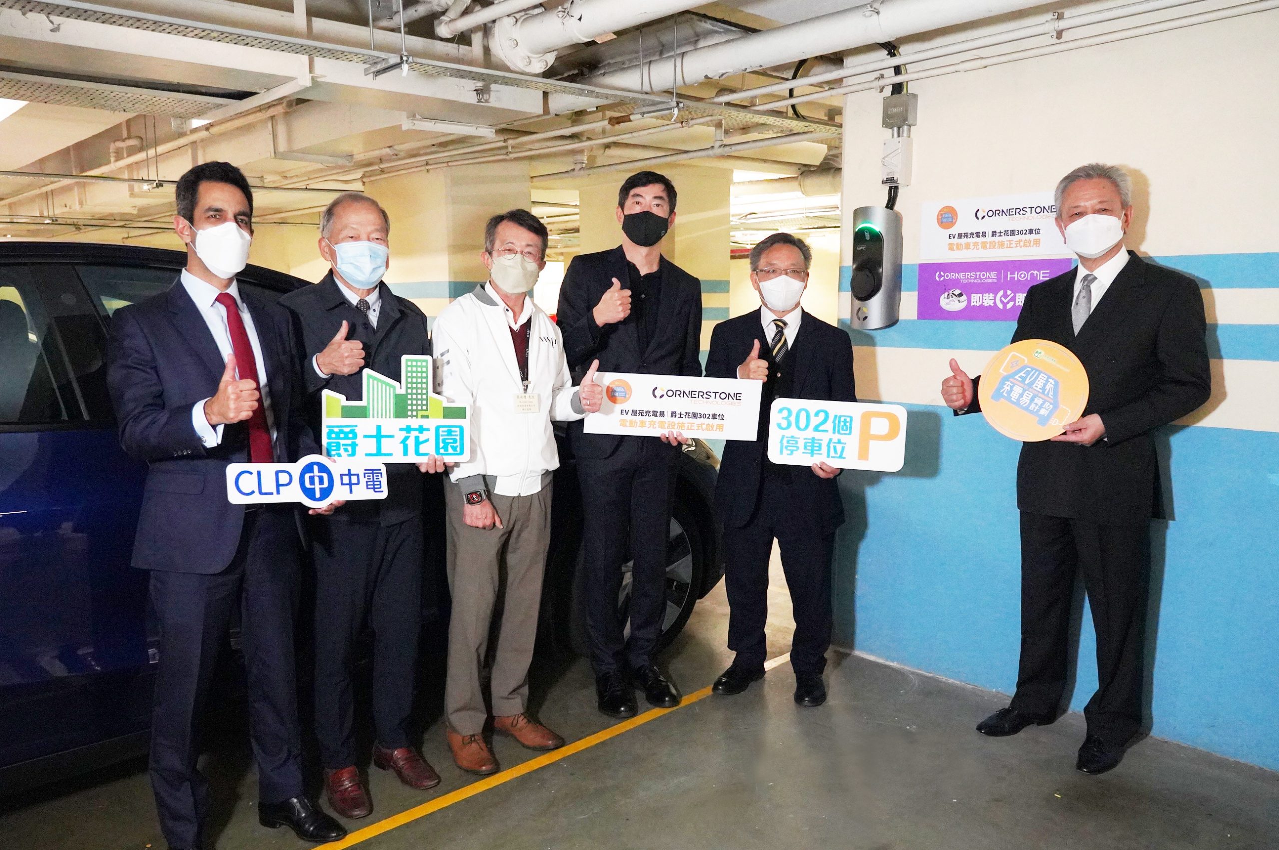 CEO of Cornerstone Technologies Mr Vincent Yip, Principal Assistant Secretary (Air Policy) of Environment and Ecology Bureau Dr Kenneth Leung, Legislative Council Member the Hon Frankie Yick, CLP Power eMobility Director Mr. Saraansh Dave, WSP Executive Director Mr. Eddie Leung yesterday (12 January) joined representatives of the owners’ corporation and property management company at The Regalia for a completion ceremony for the newly installed EV charging facilities.