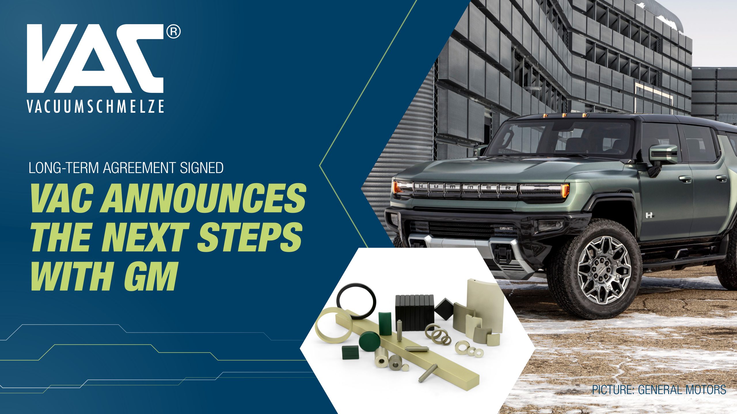 HANAU, GERMANY – Newsaktuell – 30 January 2023 – VAC announced a binding long-term supply agreement with GM for North America permanent magnet production – another major step forward to create a strong, sustainable and scalable supply chain for electric vehicles. As part of the agreement, VAC will build a facility in North America to manufacture permanent magnets for electric motors used in a broad portfolio of EVs. The new facility will use locally sourced raw materials. The binding agreement finalizes a Memorandum of Understanding VAC and GM announced in December 2021.