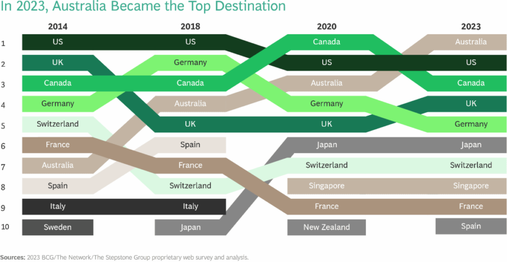 - Australia, the US, Canada, the UK, and Germany round out the top five most desired destination countries globally