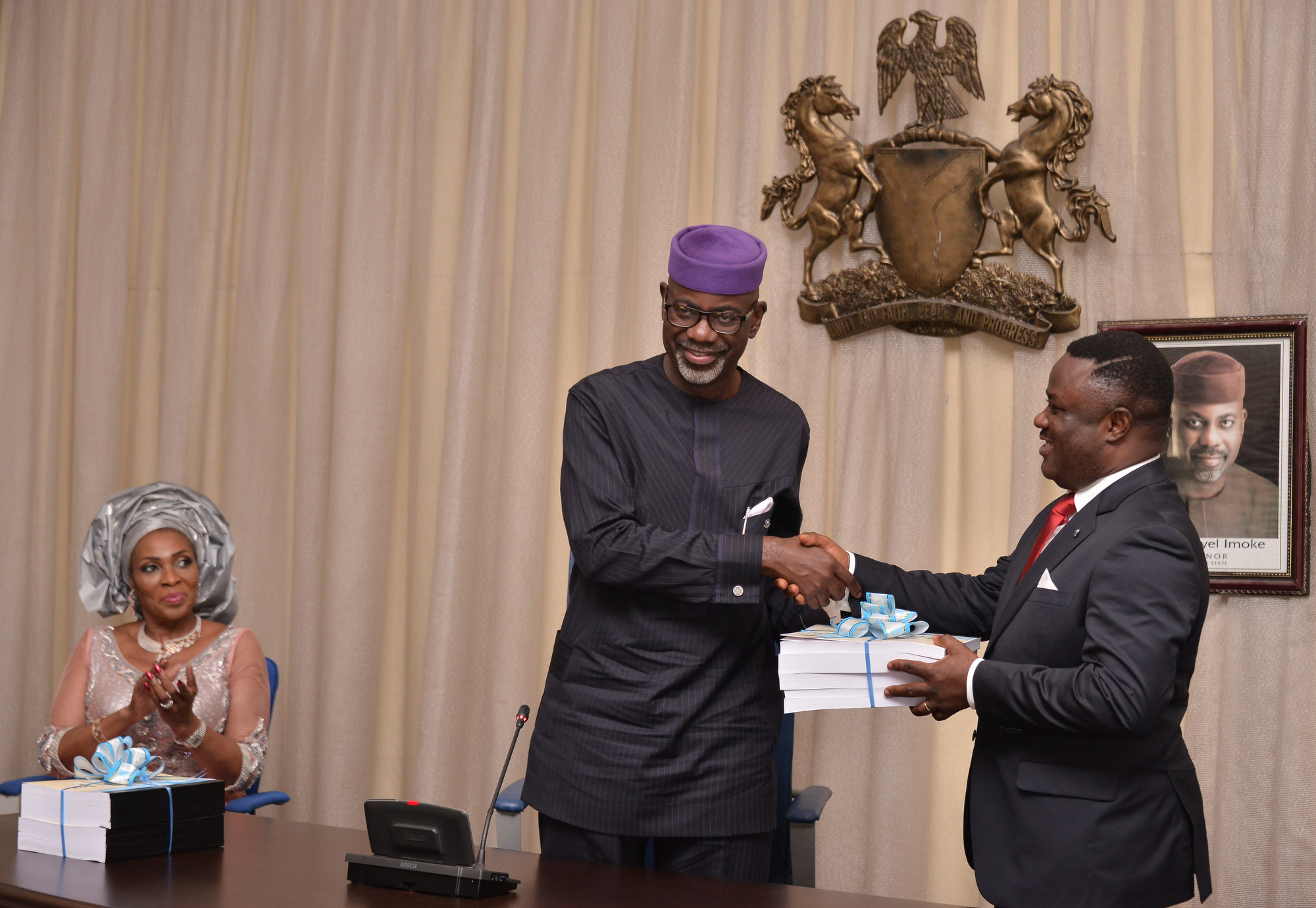 Cross River State Governor, Prof. Ben Ayade (R)receiving the handing over notes from his predecessor, Sen. Liyel Imoke while Imoke’s wife, Obioma watched in Calabar