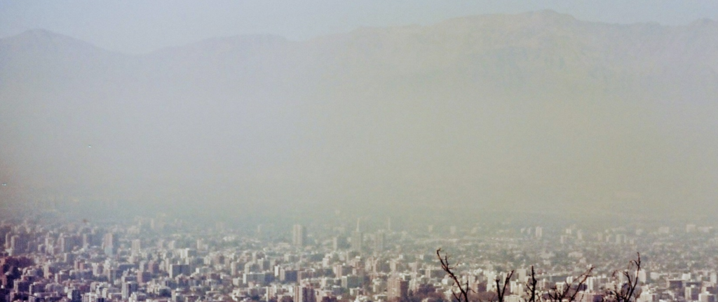 A thick cloud of smog lays over the city of Santiago, Chile.